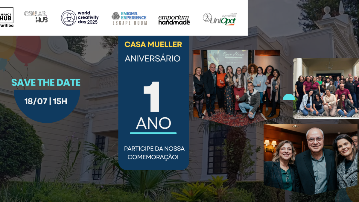 29/07/2025No próximo dia 18/07, o Impact Hub Curitiba celebra um marco muito especial: 1 ano da abertura da unidade Casa Mueller! Um espaço que nasceu com o propósito de conectar pessoas, impulsionar ideias e criar impacto real. E, claro, tudo isso só foi possível porque você esteve com a gente desde o início.